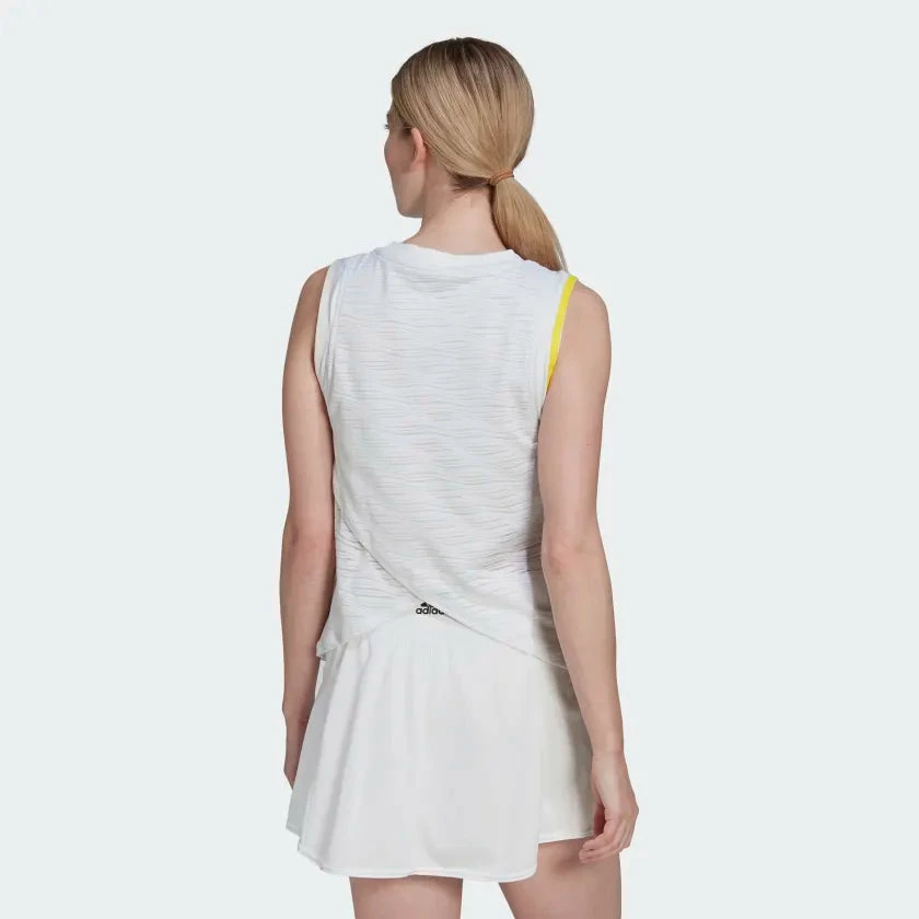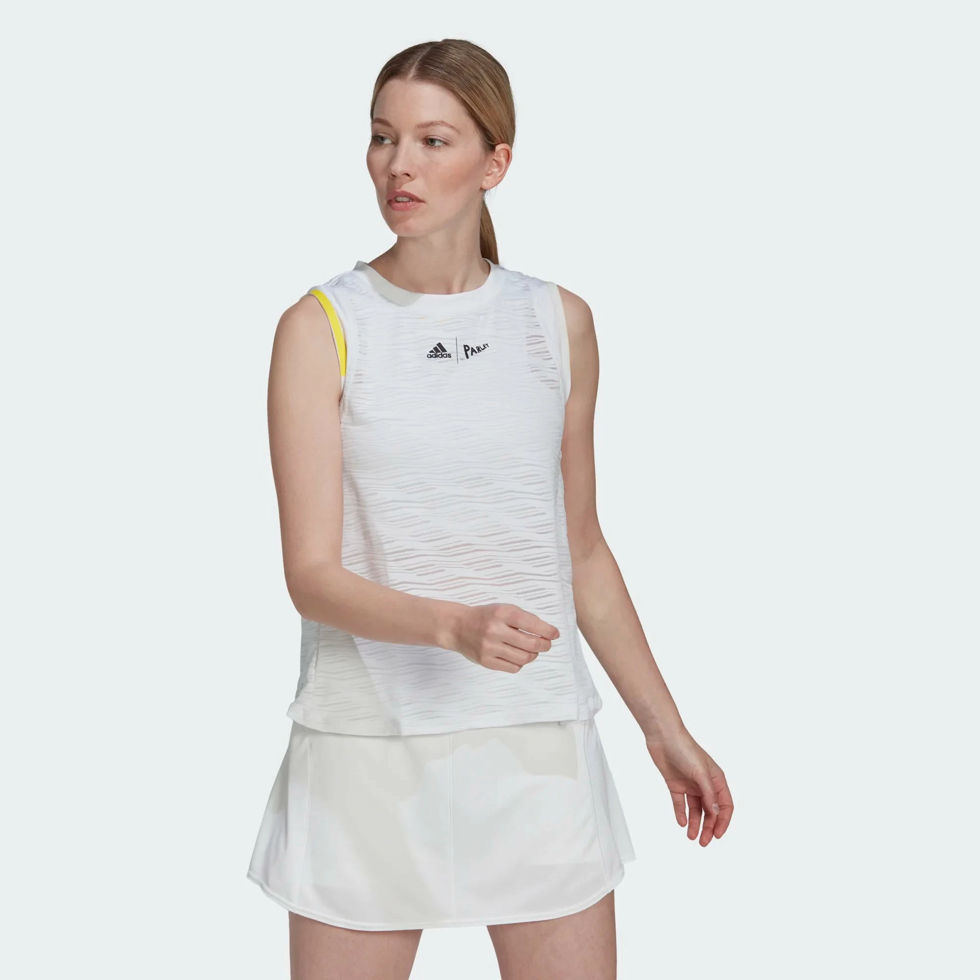 Serve for the oceans in a tennis tank top that puts the problem of plastic waste under the microscope. Part of an adidas collection created for the green grass of South-West London, its engineered graphics send a warning about the plight of our blue planet. Made with a bit of stretch to keep your game flowing, it removes distractions with mesh details and moisture-absorbing AEROREADY. The design ensures coverage at the shoulders. Educate and act. Head to Parley for the Oceans website to find out more, sign up and get involved at adidas.com/parley.  This garment is made with a yarn which contains 50% Parley Ocean Plastic — reimagined plastic waste, intercepted on remote islands, beaches, coastal communities and shorelines, preventing it from polluting our ocean. This garment contains at least 40% recycled content in total.