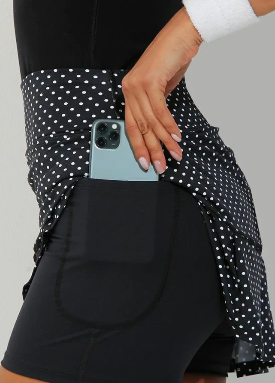 Steal the SPOTlight in our black running skirt with white polka dots for a pop of print! The basic nature of this print makes it perfect for a quick workout or a trip to the mall. Pair it with our endurance top for the complete JoJo look!Â