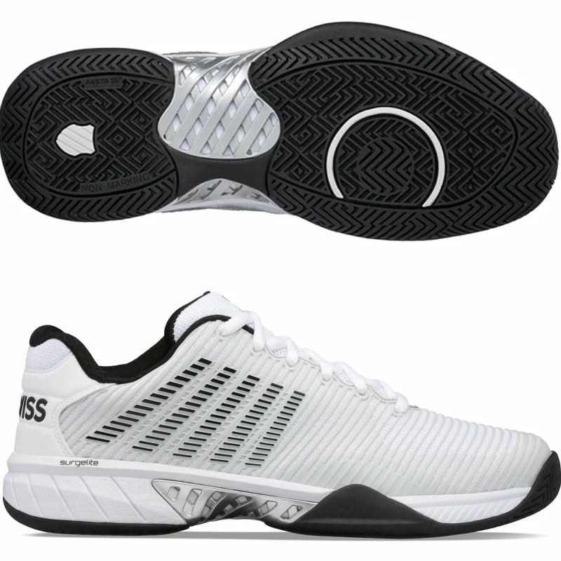 K Swiss best-selling shoe, the Hypercourt Express 2, is light, comfortable, breathable, and has a generous fit, making it the ideal choice for a variety of playing styles and levels. Durawrap Flex, gives the shoe support with no break-in period, while Surgelite midsole technology provides all day comfort.