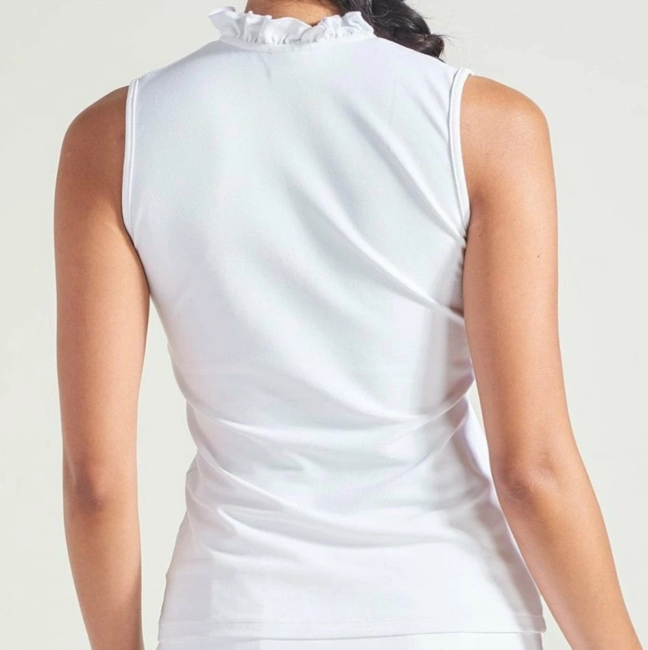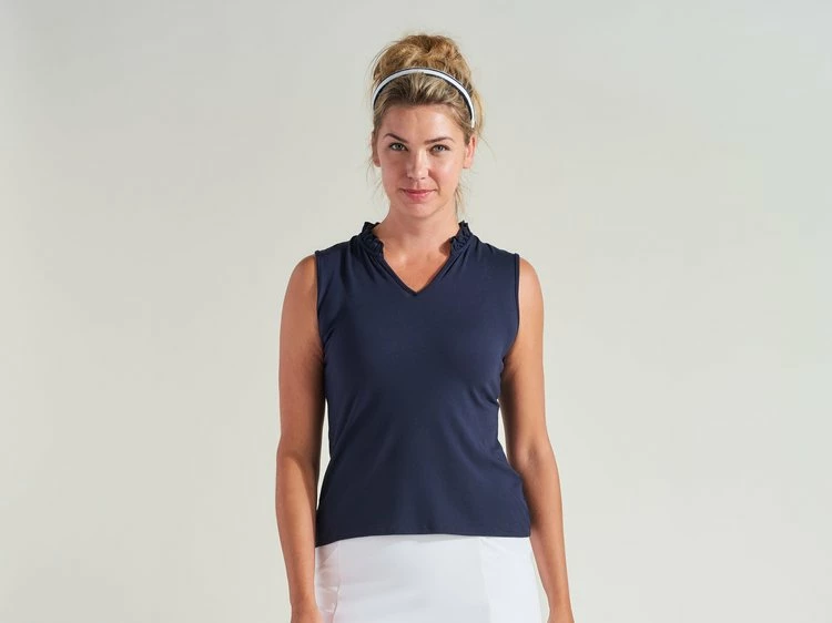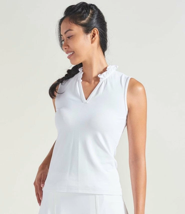 A new take on our classic sleeveless polo shirt the Ruffle Polo features a ruffled collar in our signature lightweight stretch pique fabric.