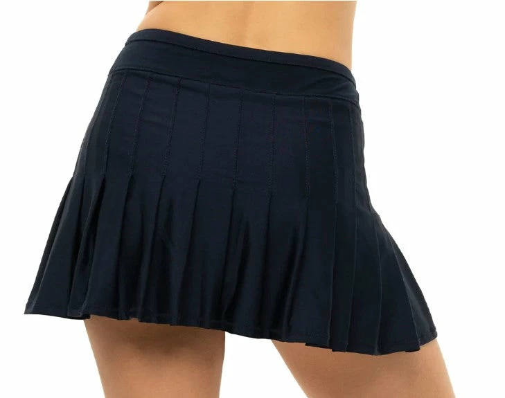 A nostalgic court skirt with a nod to the retro tennis look. This skirt features a narrow pull-on waistband with mesh overlay for a flattering fit. All the pleats are stitched down to create a form-fitting look around the waist and then open into an easy-fitting bottom flounce.  This style has a built-in shortie. Length 13.75″